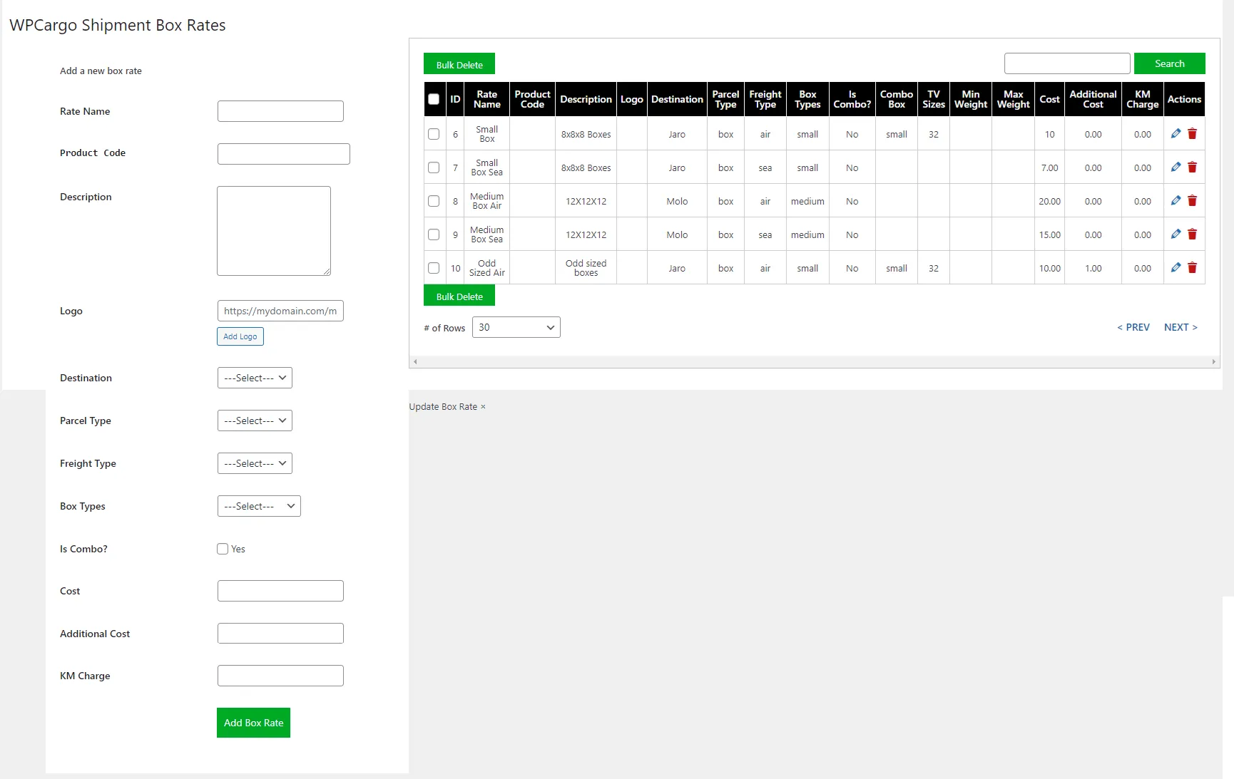 - admin can add rates for each box type, shipment type, and location