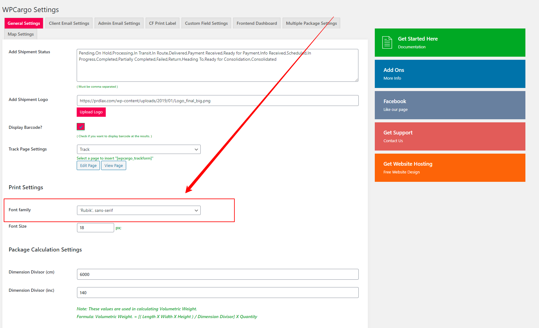 To enable font for the Arabic, Hebrew and Cyrillic go to admin dashboard -> WPCargo Menu, then select Font family options that you need.