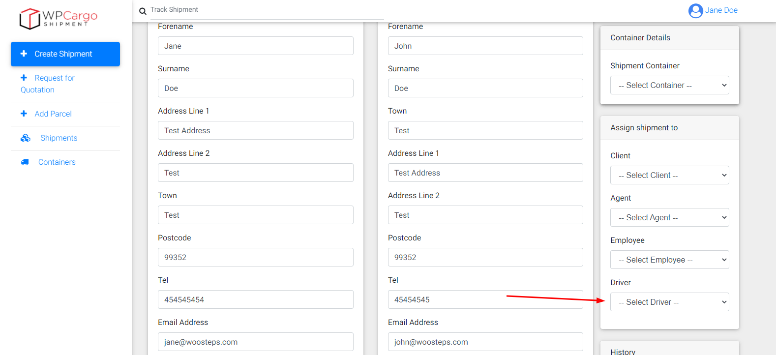 For assigning driver choose in Driver dropdown