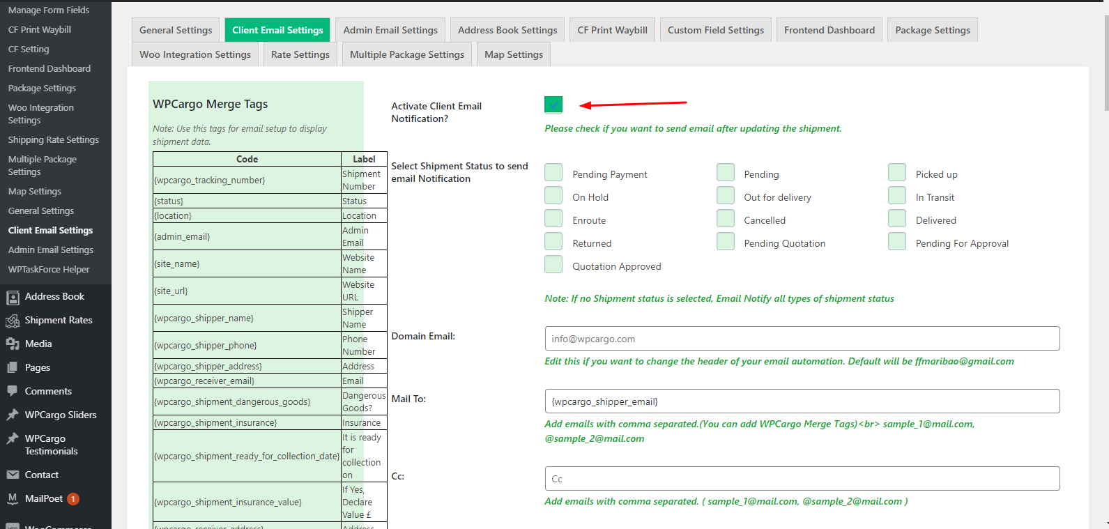 When to send email notification in WPCargo Client?