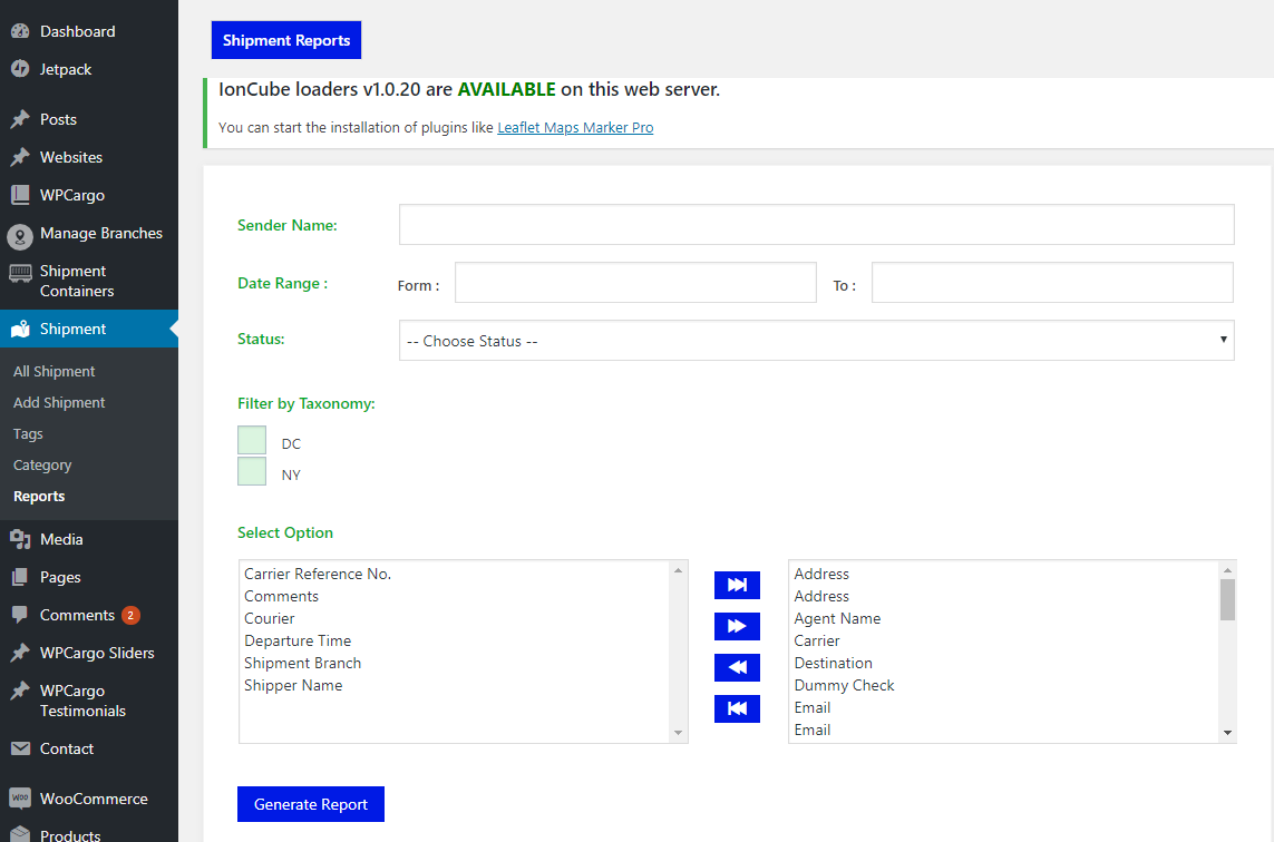 - Go to Admin Dashboard > Shipments > Reports.