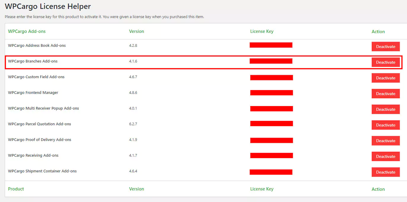- Paste license key to WPCargo Branch Manager Add-ons field and click the Activate button.