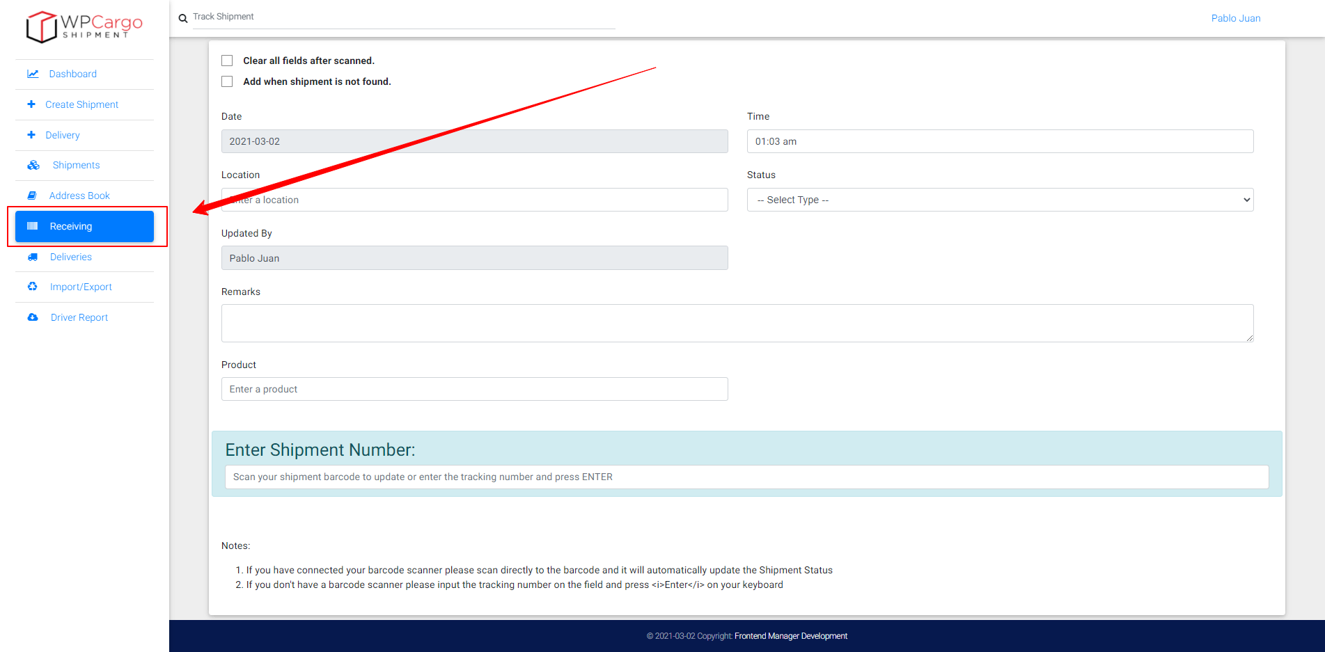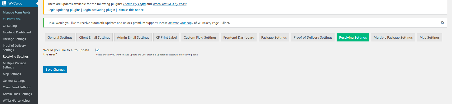 - Go to your Dashboard then WPCargo > Receiving Settings