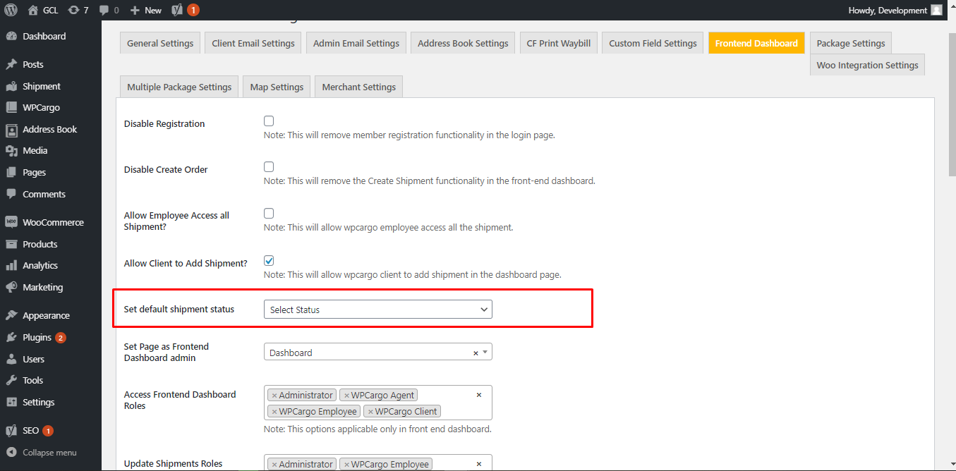 How to set default status in creating shipment using Frontend Manager Go to WPCargo > Frontend Dashboard Select status which will be default after creating a shipment