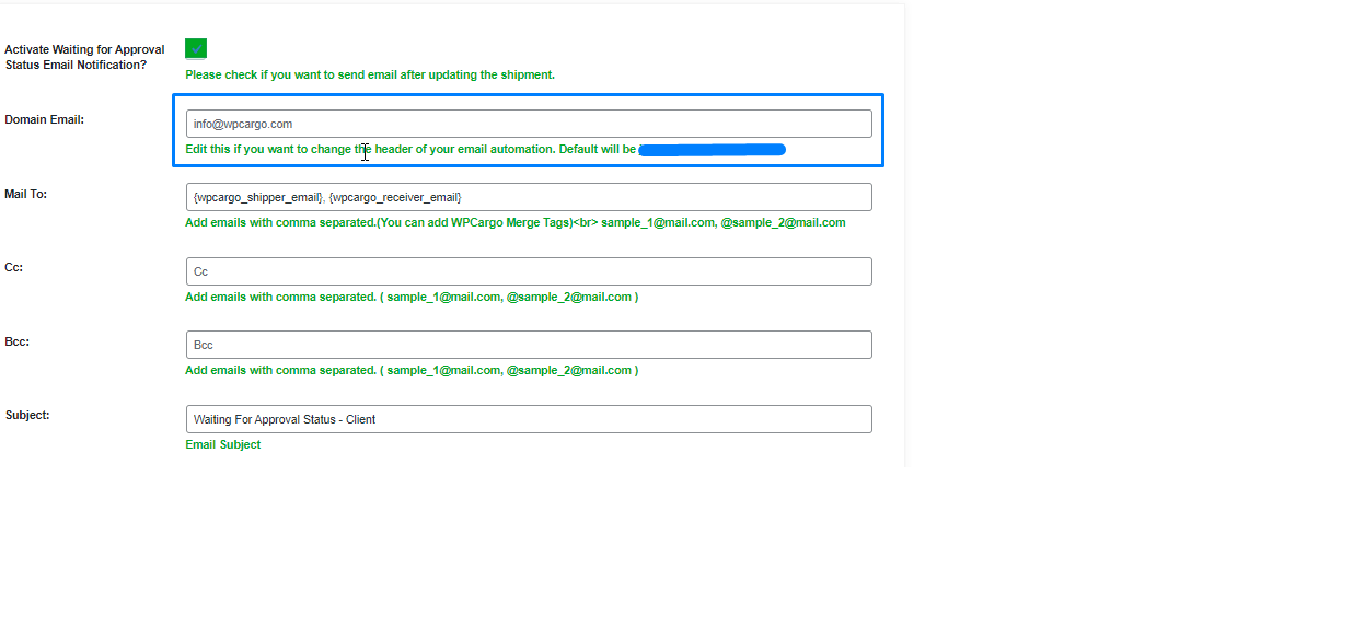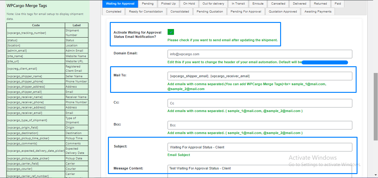 - – Make sure that you have enabled the notification by checking the “Activate Waiting for Approval Status Email Notification? checkbox.