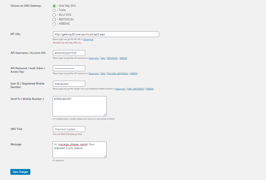 - Send To ( Mobile Number ) – Phone Numbers that you want to send to, you can use WPCargo Merge Tags.( Ex. {wpcargo_shipper_phone},{wpcargo_receiver_phone} ).