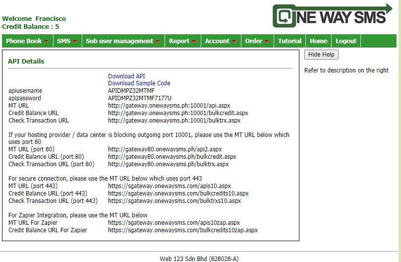 Credit Balance URL (port 80) http://gateway80.onewaysms.in/bulkcredit.aspx