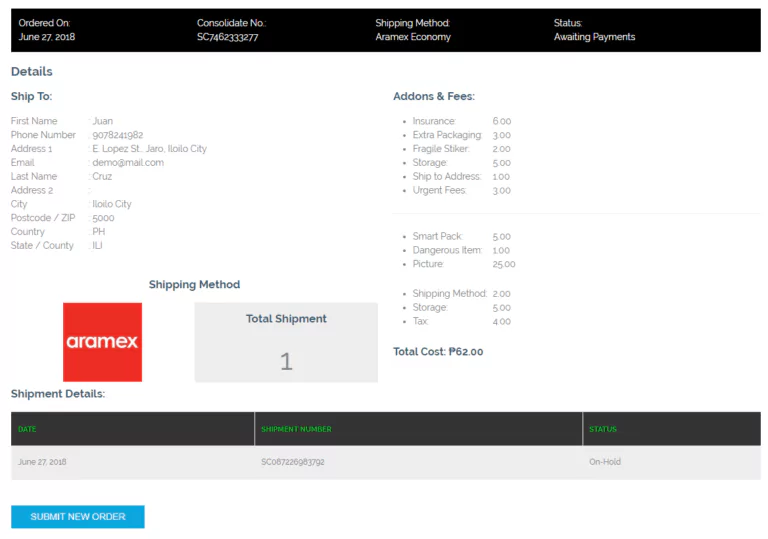 Step 2: After clicking the Pay Now you will proceed to view the Shipment Details and Click “Submit New Order” to submit Order