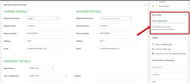 Step 3: After the payment has been create the consolidate shipment will have Woo Order Details at the shipment Right side in the admin page