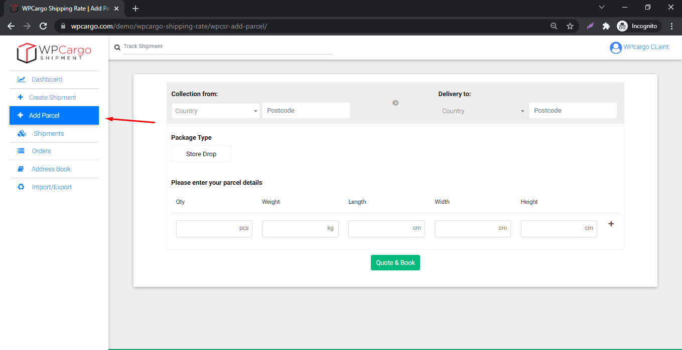 - Go to Frontend dashboard and click Add Parcel menu.