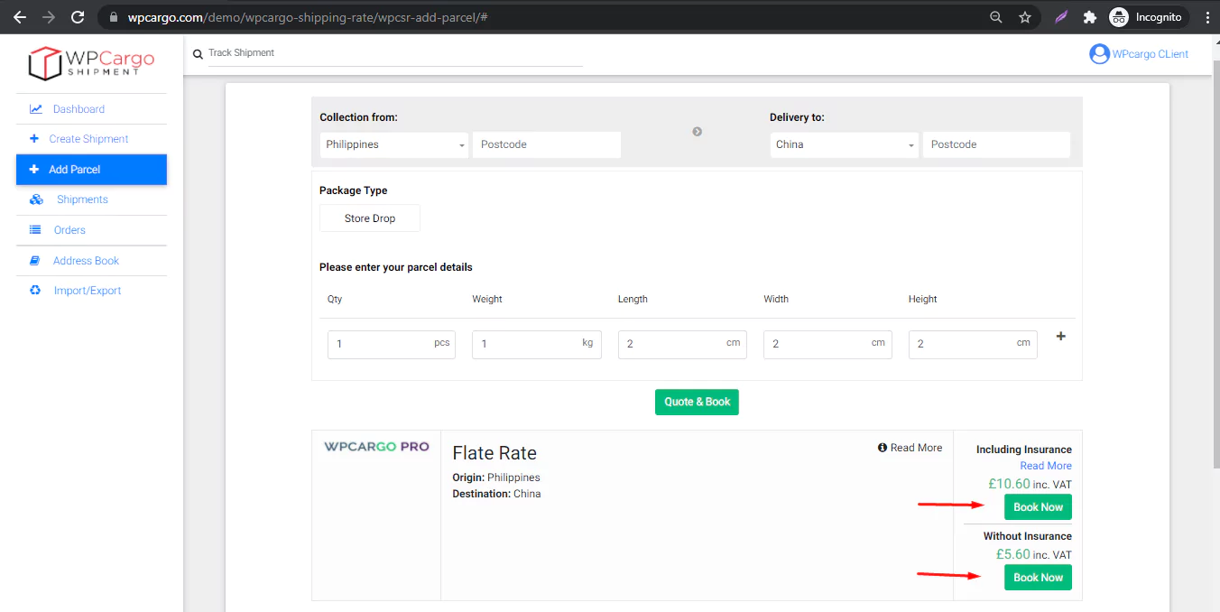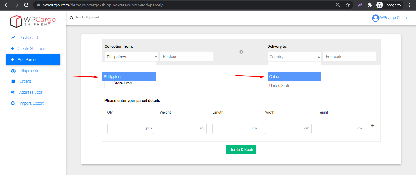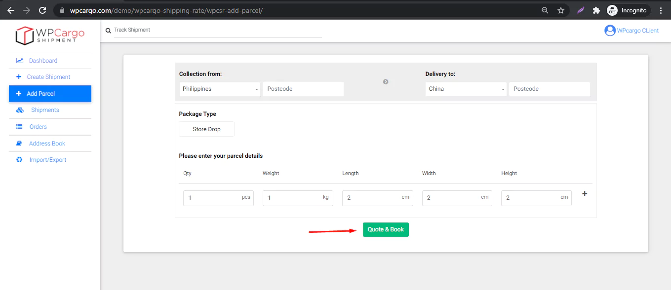 - Fill up the quantity, weight and dimensional weight and click Quote & Book button. If no results found try again another weight or try change the locations origin and destination.