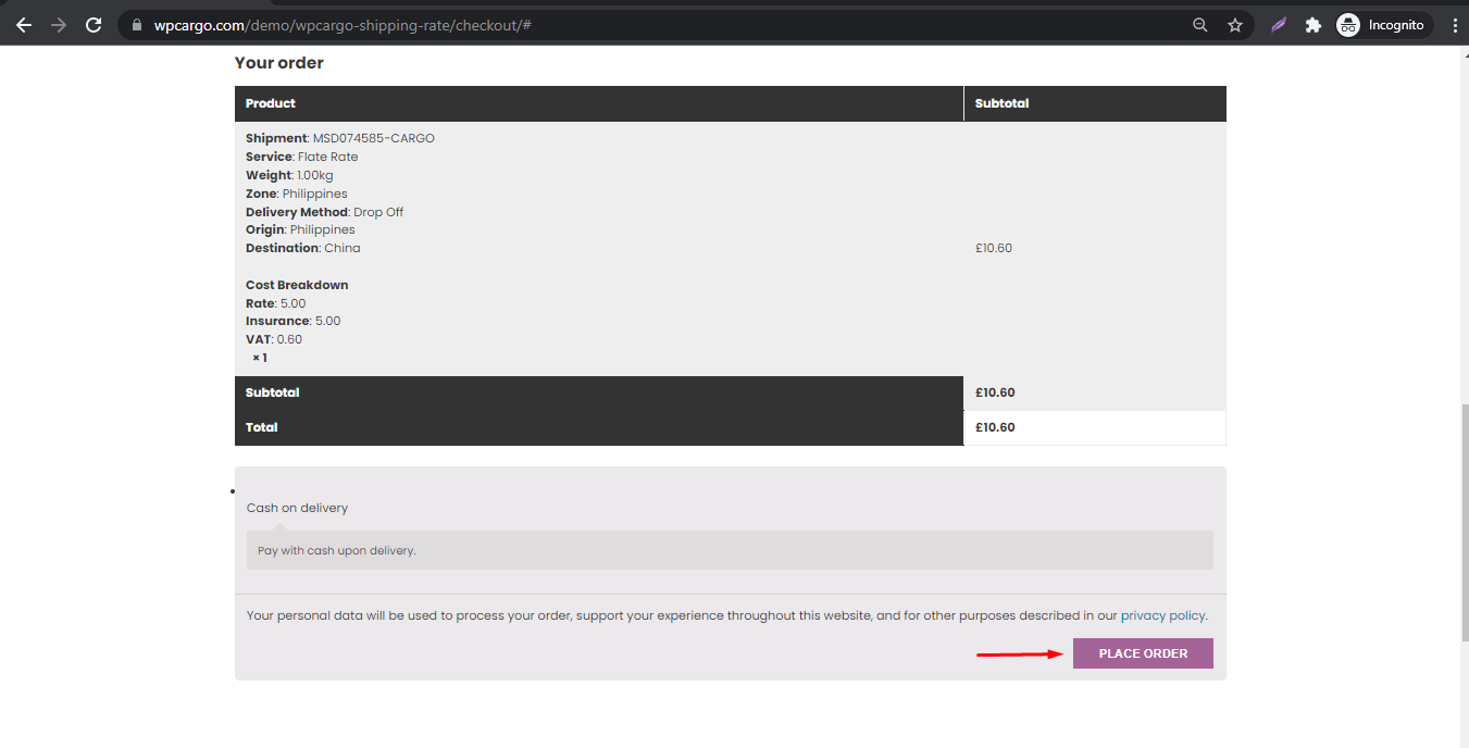 - After submits the order it will redirect to checkout. Fill out the fields and click the Place Order button.