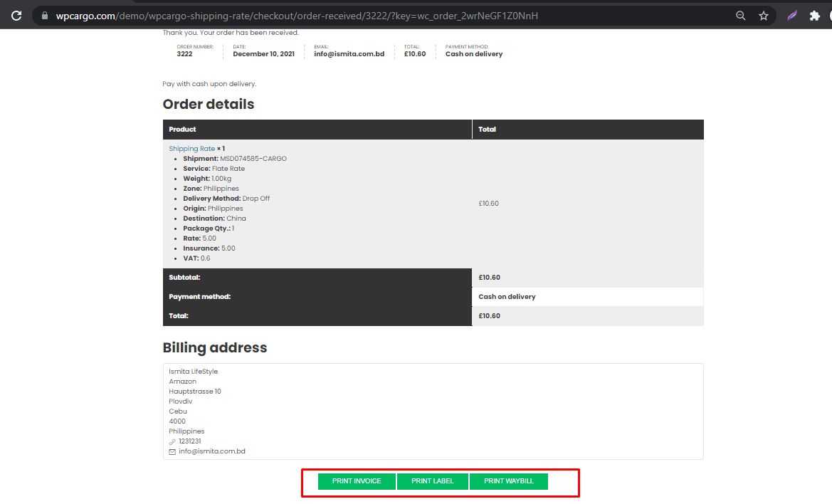 - After placing an order there are options for downloading pdf’s of Invoice, Label and Waybill