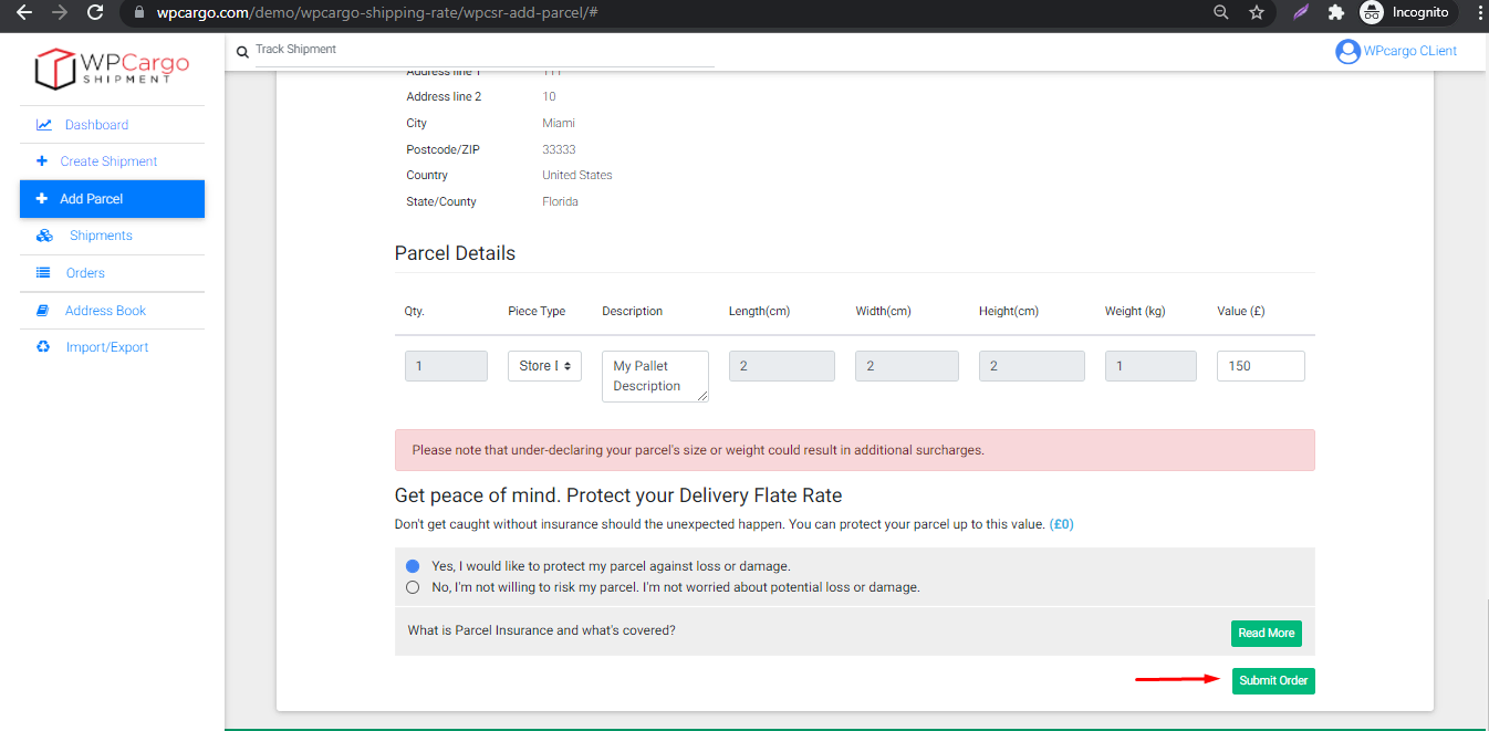 - Fill out the Shipper, Receiver and Shipment infomation. After fill out click the Submit Order button.